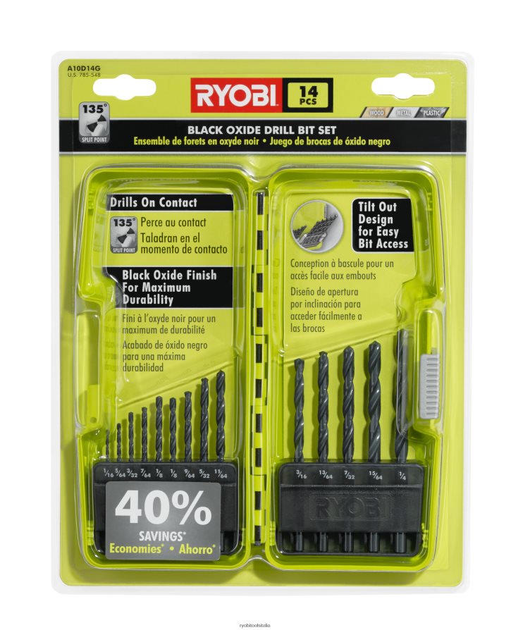il set di punte da trapano in ossido nero da 14 pezzi Ryobi include punte da 1/16 di pollice a 1/4 di pollice. Queste punte sono realizzate in acciaio ad alta velocità e una finitura in ossido nero per un’elevata durata e prevenzione della corrosione. i portapunte nella custodia si inclinano per un facile accesso. identifica rapidamente questo kit grazie alla descrizione di facile lettura sul lato della custodia. risparmia tempo e frustrazione scavando tra tutti i tuoi pezzi sciolti quando inserisci la custodia nel vassoio del sistema di archiviazione ryobi dockit (venduto separatamente).