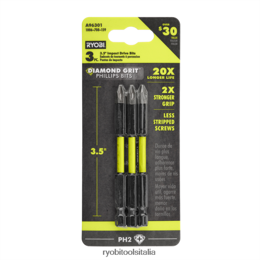 completa la tua collezione di utensili con la tecnologia rivestita con grana diamantata ryobi. questi 3 pz. Le punte per avvitamento a impatto da 3-1/2″ includono la tecnologia con rivestimento a grana diamantata. La tecnologia con rivestimento a grana diamantata fornisce un ulteriore livello di protezione per una durata 20 volte più lunga, migliorando la durata della punta in tutte le applicazioni di avvitamento a croce. La grana diamantata produce una presa 2 volte più forte che consente una forte presa prima dell’inserimento e l’inserimento dell’elemento di fissaggio nella punta. Questa presa aggiuntiva crea un’esperienza simile a quella di una punta caricata magneticamente, ma con una presa più sicura. La tecnologia con rivestimento in grana diamantata si aggancia all’elemento di fissaggio a croce durante le applicazioni di guida per un migliore montaggio per evitare di strappare la testa a croce. Questo set è una soluzione perfetta per tutti i tipi di punte dacquirenti e professionisti che cercano viti meno usurate e un controllo pre-azionamento ottimale. questi 3 pz. Le punte a percussione da 3-1/2″ sono compatibili con trapani e avvitatori a percussione standard e includono (3) punte diamantate ph2 da 3-1/2″.