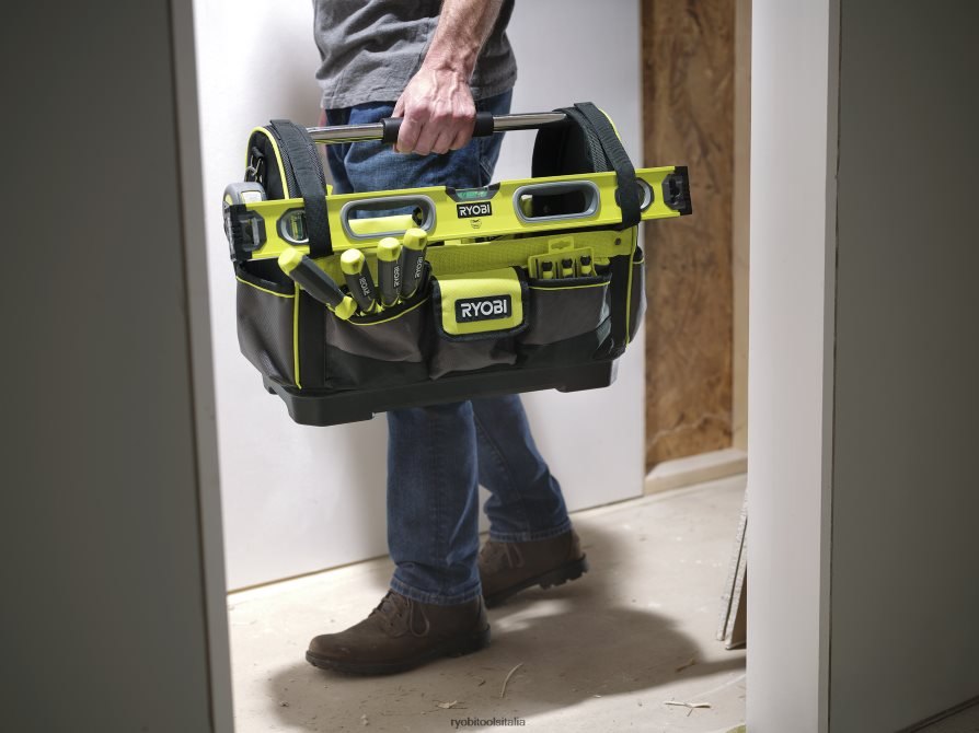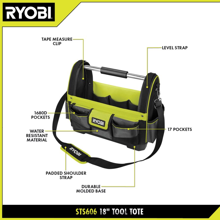 la borsa portautensili ryobi da 18″ è progettata per resistere alle condizioni di lavoro più difficili grazie alle robuste tasche 1680d, alla base sagomata durevole e al materiale resistente all’acqua. Con 17 tasche, un nastro integrato clip di misurazione e cinghia di livello c’è un posto per tutto per tenerti organizzato. la comoda tracolla imbottita e la maniglia ripiegabile offrono un’esperienza senza interruzioni mentre ti sposti da un posto all’altro.
