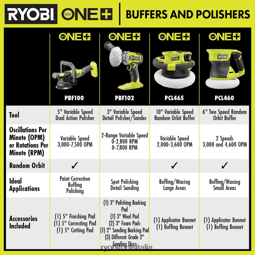 RYOBI Buffer in orbita casuale a velocità variabile da 18 V uno + 10 utensili elettrici 06V0D122
