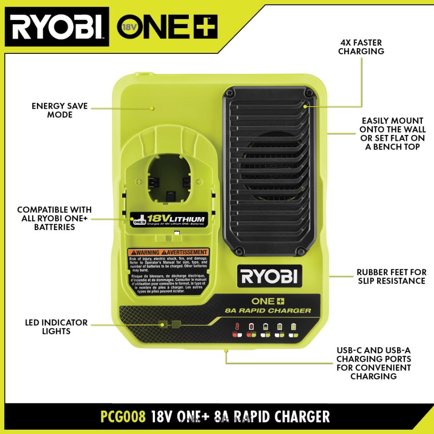 espandi il tuo sistema Ryobi 18v one+ con il caricabatterie rapido ryobi 18v one+ 8a. la ricarica è stata resa più veloce che mai. con una ricarica 4 volte più veloce rispetto al pcg002, questo caricabatterie riduce significativamente i tempi di inattività consentendo agli utenti di caricare una batteria al litio ad alte prestazioni da 8 Ah in meno di un’ora. dotato di indicatori luminosi a LED, gli utenti possono facilmente identificare lo stato di carica della batteria. le porte di ricarica USB-C e USB-A consentono agli utenti di caricare comodamente i propri dispositivi elettronici portatili. i piedini in gomma forniscono una base antiscivolo per evitare che il caricabatterie scivoli nell’area di lavoro. la modalità di risparmio energetico consente di risparmiare energia quando non si caricano o non si mantengono le batterie. per massimizzare lo spazio di lavoro, la possibilità di montaggio a parete garantisce l’organizzazione in qualsiasi momento. meglio di tutto, fa parte del sistema ryobi 18v one+ di oltre 280 coProdotti rdless che funzionano tutti sulla stessa piattaforma di batterie. questo caricabatterie rapido 18 V one+ 8a è coperto dalla garanzia del produttore ryobi di 3 anni e include (1) caricabatterie rapido pcg008 18 V 8a e manuale dell’operatore. batteria venduta separatamente.