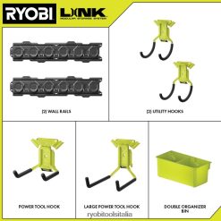 il sistema di storage modulare ryobi link sta rivoluzionando il settore dello storage, consentendoti di organizzare, accedere e trasportare la tua vita. il ryobi link 7 pz. Il kit di stoccaggio a parete ti consente di ottimizzare lo stoccaggio del tuo garage con un’organizzazione personalizzabile dello stoccaggio degli attrezzi. i due binari da parete da 33 pollici sono un organizer da parete per garage facilmente installabile con punti di montaggio visibili e forniscono il massimo impegno dei perni per sostenere una capacità di peso di 75 libbre per piede. questo kit include quattro ganci per riporre gli oggetti in garage per fornirti le basi per organizzare la tua vita ed espandere facilmente i tuoi sistemi di stoccaggio in garage con una gamma completa di soluzioni di stoccaggio. appendere utensili manuali ed elettrici, attrezzature per esterni, attrezzature sportive e ogni hobby in mezzo. meglio di tutto, fa parte del sistema di archiviazione modulare ryobi linkm linea di prodotti che utilizzano la stessa tecnologia di chiusura per connettere perfettamente le tue esigenze di archiviazione mobile e fissa. possiedi il tuo spazio con il sistema di archiviazione modulare ryobi link.