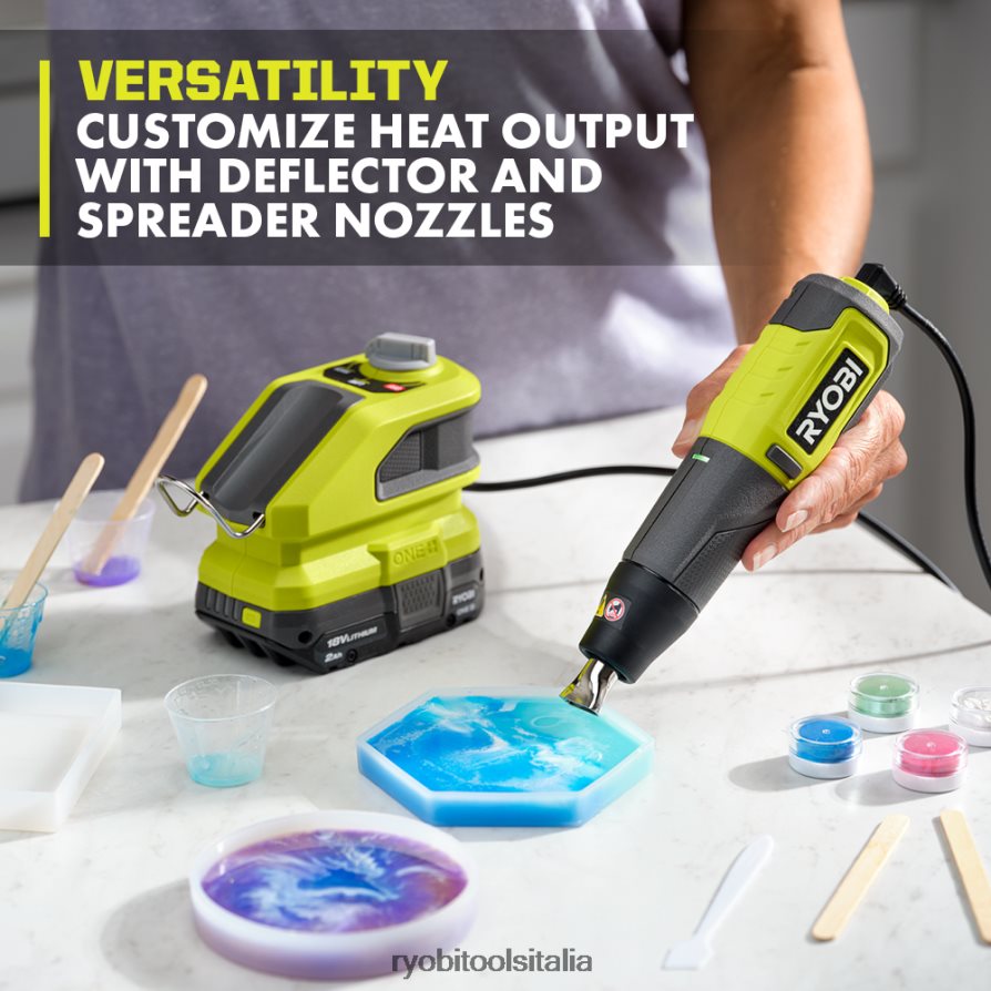 espandi il tuo sistema ryobi 18v one+ con la penna termica ryobi 18v one+. il doppio quadrante di controllo della temperatura che va da 450 gradi/750 gradi facilita il lavoro con materiali sensibili al calore. Il design compatto di questa penna termica da 18 V è ideale per applicazioni precise come rimozione di adesivi, sverniciatura, trasferimento di calore, tubi termorestringenti e altro ancora. il supporto integrato facilita l’utilizzo a mani libere. riflette e disperde facilmente il calore con il deflettore e gli ugelli diffusori inclusi nel vano accessori di bordo per una maggiore comodità. parte del sistema ryobi one+: qualsiasi batteria 18v one+ funziona con qualsiasi prodotto 18v one+. questa penna termica 18 V one+ è coperta dalla garanzia del produttore ryobi di 3 anni e include penna termica pcl916 18 V one+, batteria al litio 18 V one+ 2ah, caricabatterie 18 V one+, ugello deflettore, sbocchetta di raccolta e manuale dell’operatore.