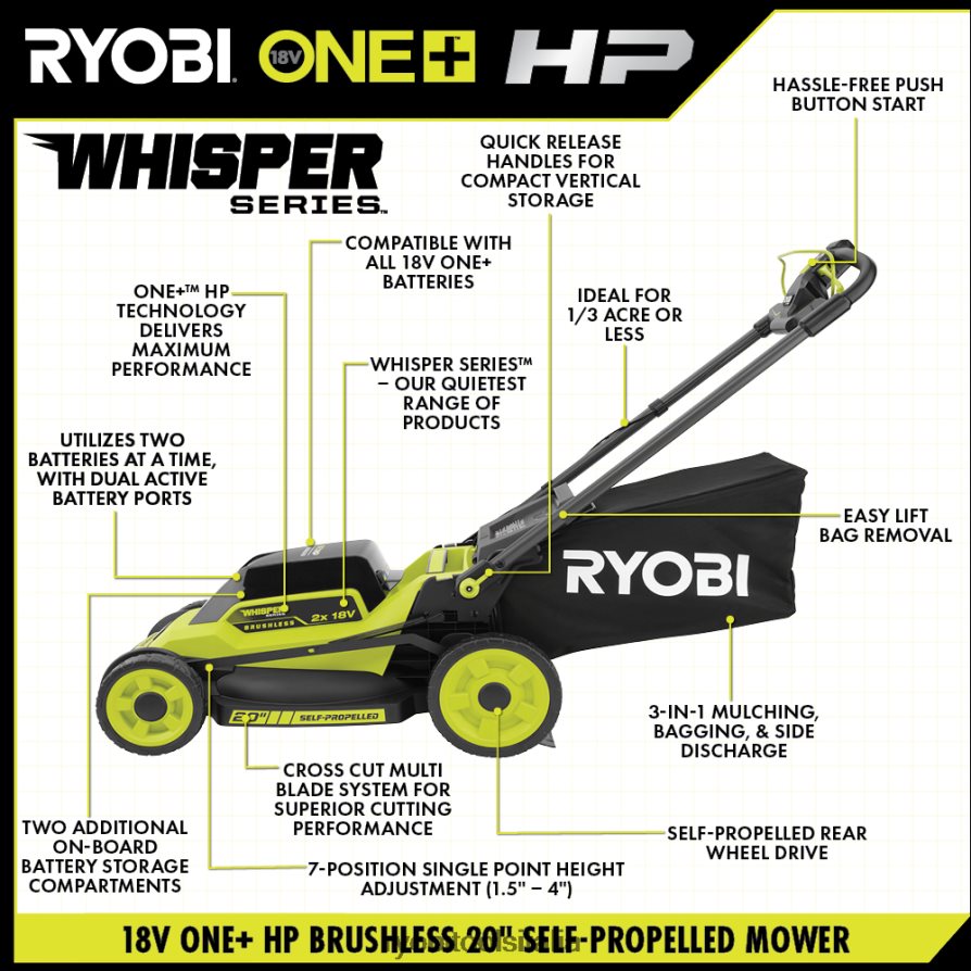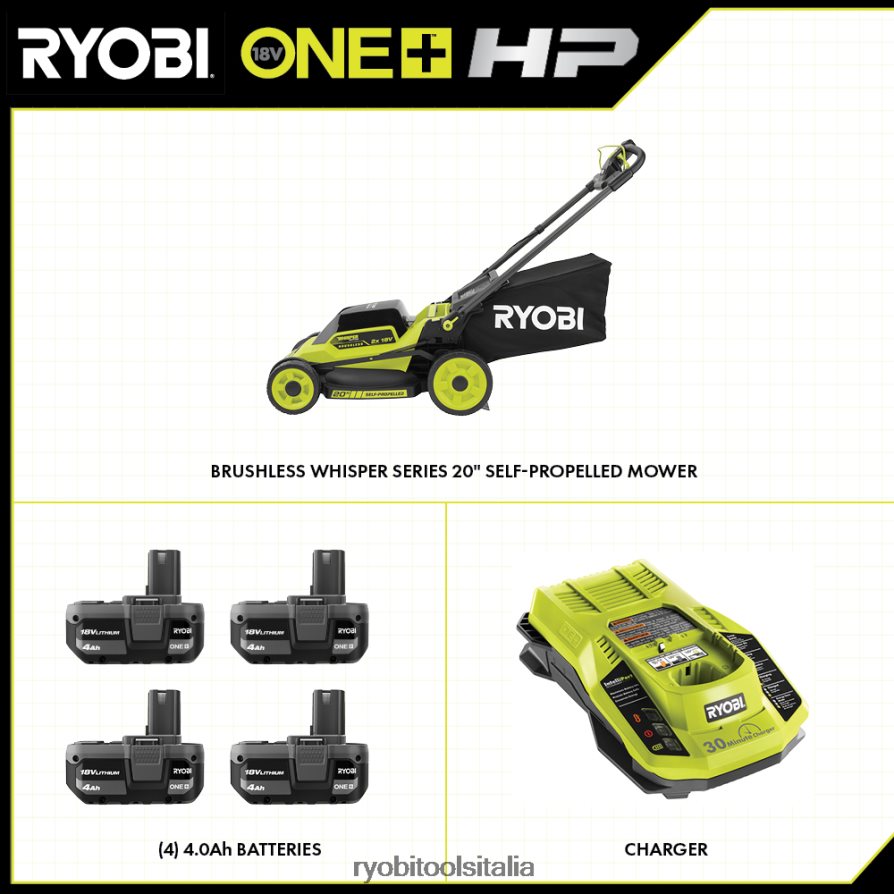 entra nel sistema 18v one+ con il ryobi one+ 18v hp brushless 20″ self- Tosaerba a propulsione. Alimentato dalla rivoluzionaria tecnologia one+ hp, questo tosaerba offre più potenza di un tosaerba a gas da 150 cc, il tutto pur essendo il 60% più silenzioso dei tosaerba a gas e persino più silenzioso di altri tosaerba a batteria. Con (4) batterie da 18 V one+ 4 Ah incluse, questo tosaerba garantisce fino a 45 minuti di autonomia, rendendolo perfetto per prati fino a 1/3 acro.il sistema multilama a taglio trasversale offre un taglio superiore, producendo le migliori prestazioni di raccolta, mulching e scarico laterale del settore.la tecnologia one+ hp combina un motore brushless, elettronica avanzata e tecnologia al litio ad alte prestazioni che lavorano insieme per aumentare la velocità e la potenza della lama nei tagli più difficili, il tutto con la semplice pressione di un pulsante.Il sistema di trasmissione semovente ad alta velocità garantisce un’esperienza di taglio efficiente e senza sforzo. con caratteristiche come le maniglie facili da piegare per uno stoccaggio compatto, la regolazione dell’altezza in un unico punto e la rimozione del sacco facile da sollevare, il taglio e lo stoccaggio non sono mai stati così facili. meglio di tutto, fa parte del sistema ryobi 18v one+ in cui qualsiasi batteria 18v one+ funziona con qualsiasi prodotto 18v one+. Il kit include il tosaerba brushless p11011 18v one+ hp da 20″, (4) batterie al litio pbp005 18v one+ 4ah, (2) caricabatterie rapidi p117 18v one+, sacco raccoglierba, tappo per pacciamatura, chiave di avviamento, scivolo di scarico laterale e manuali dell’operatore .