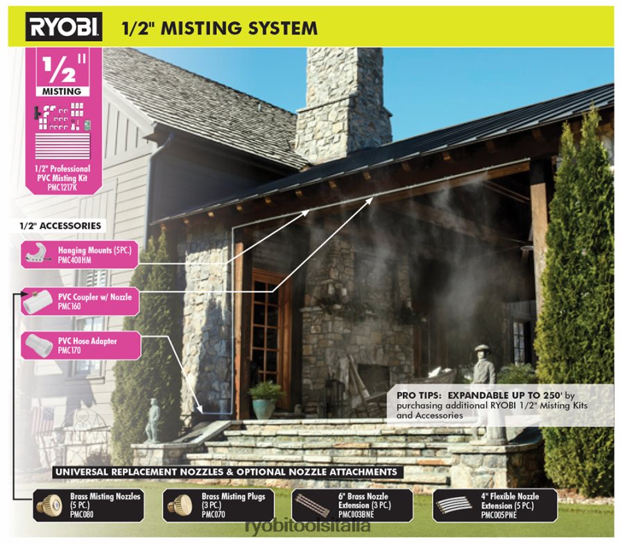 i kit e gli accessori di nebulizzazione ryobi sono il modo più semplice ed efficiente per fornire l’ambiente fresco e confortevole che desideri. il raccordo in PVC Ryobi da 1/2 pollice con ugello è progettato per estendere i sistemi di nebulizzazione esistenti da 1/2 pollice fino a 250 piedi. questo raccordo è completo di ugello in ottone e acciaio inox per un flusso d’acqua ottimale. il raccordo in PVC Ryobi da 1/2 pollice con ugello può essere utilizzato con la maggior parte dei tubi in PVC da 1/2 pollice. questo articolo, insieme a tutti gli altri kit e accessori di nebulizzazione Ryobi, è progettato per l’uso esterno solo con acqua fredda.