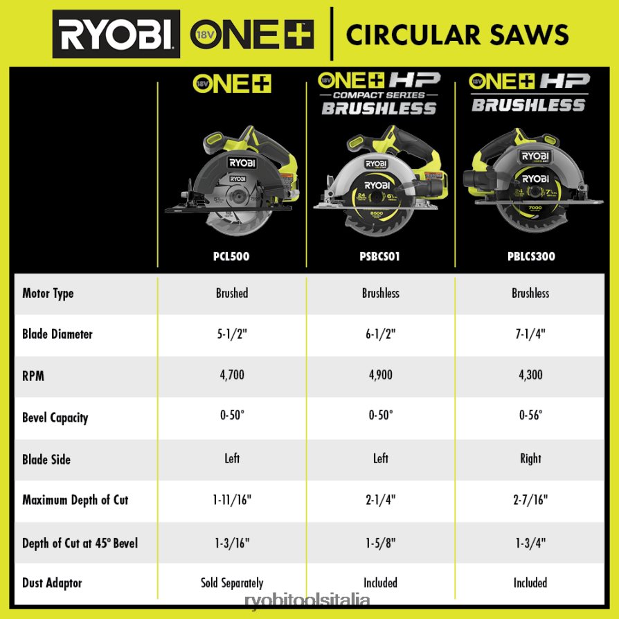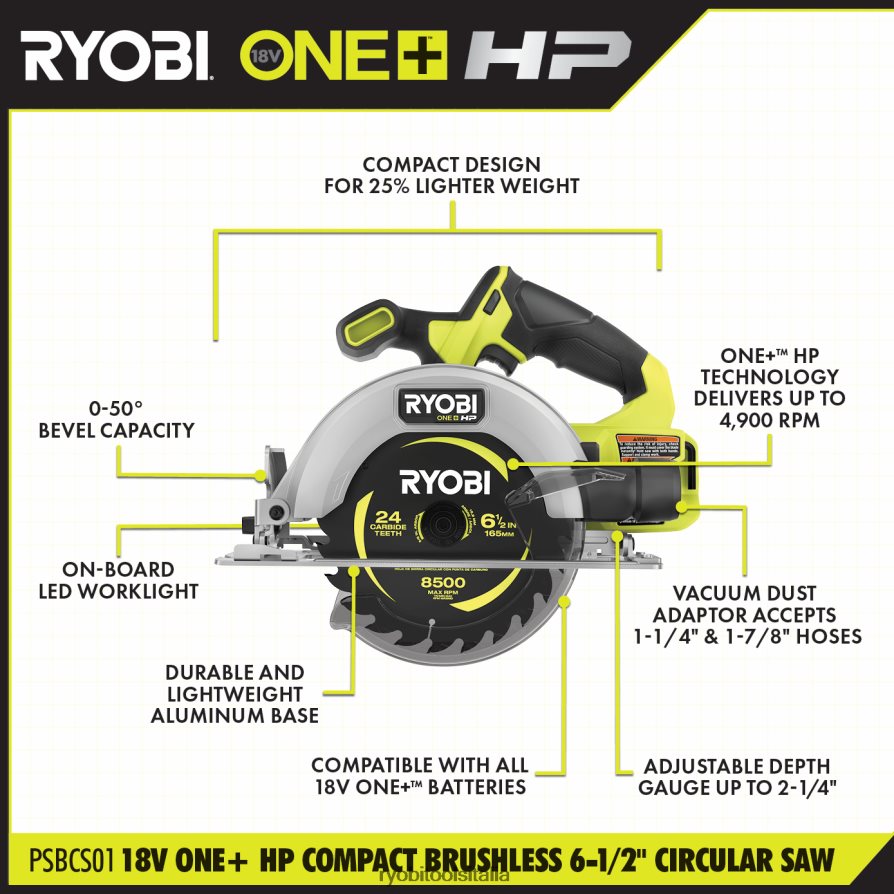 migliora il tuo sistema Ryobi 18v one+ hp con la sega circolare compatta ryobi 18v one+ hp brushless da 6-1/2″. La tecnologia one+ hp offre più potenza, autonomia, durata e velocità utilizzando motori brushless , elettronica avanzata e tecnologia al litio ad alte prestazioni. La nostra sega circolare da 6-1/2″ fa parte della serie compatta ed è più leggera del 25% garantendo portabilità e facilità d’uso. con 4.900 giri al minuto, questa sega fornisce un taglio più veloce del 32% e fino a 350 tagli per carica per fornire potenza tutto il giorno. questa sega circolare compatta offre agli utenti la massima versatilità di taglio con un misuratore di profondità regolabile che può tagliare fino a 2-1/4″ di profondità e può smussare da 0 a 50 gradi. abbiamo aggiornato la base in alluminio per renderla più leggera e resistente anche per i lavori più difficili di lavori.gli utenti hanno la massima visibilità in linea visiva grazie alla luce di lavoro a LED integrata che illumina l’altezzatagliarli con facilità. questa sega circolare brushless compatta da 6-1/2″ 18v one+ hp è coperta dalla garanzia del produttore ryobi di 3 anni e include (1) sega circolare brushless compatta da 6-1/2″ psbcs01 18v one+ hp, (1) adattatore per aspirapolvere , (1) lama per taglio sottile in carburo da 24 t, (1) chiave esagonale e manuale dell’operatore. batteria e caricabatterie venduti separatamente.