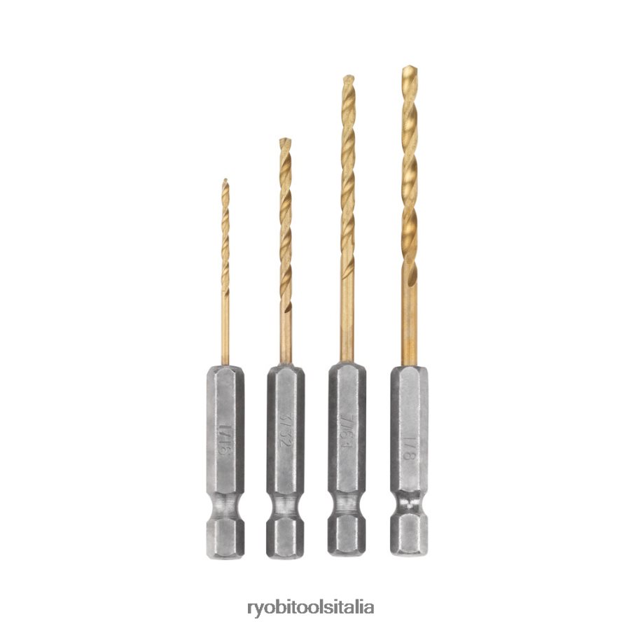 il set di punte da trapano in titanio ryobi speed load plus da 4 pezzi con gambo esagonale è per utilizzare per forare legno, plastica e metallo. il kit include punte da trapano in acciaio rapido al titanio nelle dimensioni di 1/16 pollici, 3/32 pollici, 7/64 pollici e 1/8 pollici. Il rivestimento in titanio riduce l’attrito e aumenta la velocità di foratura nelle applicazioni di perforazione dei metalli.