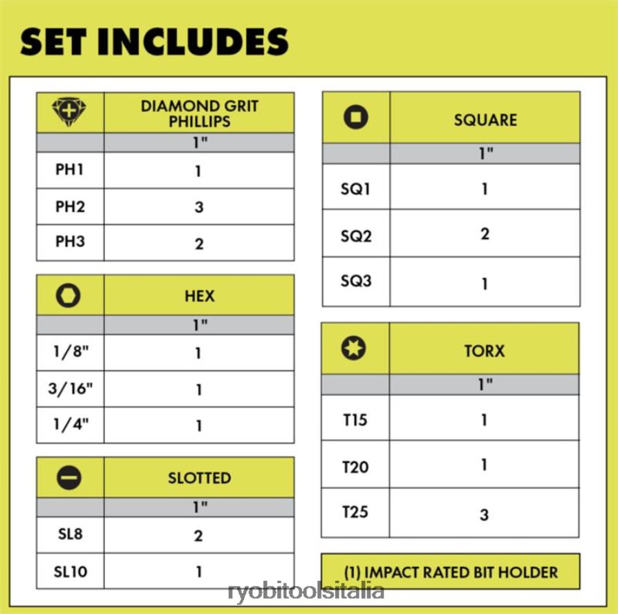 completa la tua collezione di utensili con la tecnologia rivestita con grana diamantata ryobi. questi 22 pz. Le punte a percussione da 1″ includono punte Phillips a impatto con rivestimento diamantato e punte aggiuntive con classificazione a impatto. La tecnologia con rivestimento a grana diamantata fornisce un ulteriore livello di protezione per una durata 20 volte più lunga, migliorando la durata della punta in tutte le applicazioni di avvitamento a croce. La grana diamantata produce un 2x presa più forte che consente una forte presa prima dell’inserimento e il posizionamento dell’elemento di fissaggio nella punta. questa presa aggiuntiva crea un’esperienza simile a quella di una punta caricata magneticamente, ma con una presa più sicura. la tecnologia con rivestimento in grana diamantata si aggancia all’elemento di fissaggio Phillips durante le applicazioni di guida per un migliore montaggio ed evitare lo stripping della testa a croce. questo setoffre un’ampia varietà di soluzioni di guida in grado di soddisfare le esigenze dei professionisti e degli hobbisti. questi 22 pz. Le punte a percussione da 1″ sono compatibili con trapani e avvitatori a percussione standard e includono (1) supporto per punte magnetiche a impatto, (1) diamante da 1″ ph1, (3) diamante da 1″ ph2, (2) diamante da 1″ ph3, (1 ) t15, (1) t20, (3) t25, (1) esadecimale 1/8″, (1) esadecimale 3/16″, (1) esadecimale 1/4″, (2) sl8, (1) sl10, (1) sq1, (2) sq2 e (1) sq3.