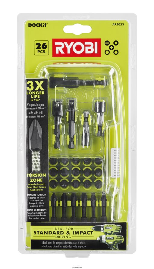 ryobi presenta il kit di guida a impatto da 26 pezzi, l’ultima novità nella tecnologia di guida ryobi. la zona di torsione di nuova progettazione assorbe l’impatto delle applicazioni di guida a coppia elevata, garantendo una durata 3 volte più lunga. Queste punte versatili sono ideali sia per la guida standard che per quella a impatto, quindi puoi utilizzare il tuo trapano/avvitatore o il tuo avvitatore a percussione con compatibilità e prestazioni perfette. I nuovi inserti per guida a impatto di ryobi sono costruiti per durare e gestire le tue esigenze di guida più impegnative.