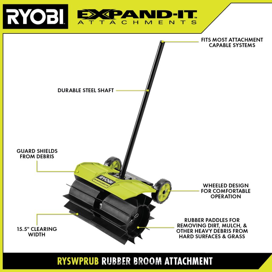 espandi il tuo sistema ryobi con l’accessorio per scopa in gomma ryobi espanso-it. come parte del sistema di attacco ryobi espanso-it, trasforma facilmente il tuo decespugliatore con attacco in una scopa di gomma risparmiando denaro, tempo e spazio. questa scopa in gomma rimuove sporco, pacciame e altri detriti pesanti con le sue pale in gomma da superfici dure ed erba. con una larghezza di lavoro di 15,5” è possibile portare a termine rapidamente il lavoro. è dotato di un albero in acciaio resistente, una protezione per proteggere dai detriti e ruote per un trasporto e un funzionamento confortevoli. l’accessorio per scopa in gomma ryobi espanso-it è compatibile con la maggior parte dei sistemi compatibili con attacchi a gas e senza fili. è coperto dalla garanzia del produttore ryobi di 3 anni e include l’accessorio per scopa in gomma ryswprub, impugnatura a J con hardware, ruote e manuale dell’operatore.