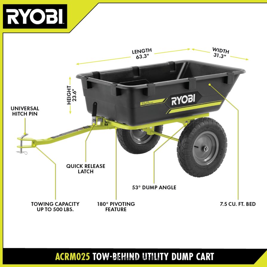 il carrello ribaltabile ryobi con attacco universale fornisce un trasporto e un traino versatili per l’uso quotidiano. collega questo carrello ribaltabile a un tosaerba, a un tosaerba con raggio di sterzata zero o a un trattore da giardino per trasportare facilmente carichi attraverso la tua proprietà. con una capacità di traino fino a 500 libbre e un letto da 7,5 piedi ^ 3, trasporta facilmente pacciame, terra, piante, rocce, legna da ardere, attrezzi da giardino e altro ancora. risparmia tempo con la funzione di rotazione a 180 gradi che ti consente di scaricare comodamente e con precisione a sinistra, a destra o sul retro del tosaerba parcheggiato. questo carrello ribaltabile è progettato per gestire i lavori più difficili con un telaio in acciaio resistente e pneumatici da 16 pollici per tutti i terreni. Svuota facilmente il carrello ribaltabile con la base girevole a 180 gradi, l’angolo di scarico di 53 gradi e la chiusura a sgancio rapido. il perno di attacco universale si adatta alla maggior parte dei viaggitosaerba, tosaerba a raggio di svolta zero e trattorini da giardino. personalizza il tuo carrello ribaltabile con gli slot di estensione dei picchetti integrati che ti consentono di costruire i tuoi pannelli laterali e divisori. questo carrello ribaltabile da traino con attacco universale include telaio in acciaio, contenitore, estensione del tubo metallico, attacco in metallo, asse, pneumatici, hardware di montaggio e manuale dell’operatore.