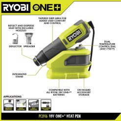 espandi il tuo sistema ryobi 18v one+ con la penna termica ryobi 18v one+. il doppio quadrante di controllo della temperatura che va da 450 gradi/750 gradi facilita il lavoro con materiali sensibili al calore. Il design compatto di questa penna termica da 18 V è ideale per applicazioni precise come rimozione di adesivi, sverniciatura, trasferimento di calore, tubi termorestringenti e altro ancora. il supporto integrato facilita l’utilizzo a mani libere. riflette e disperde facilmente il calore con il deflettore e gli ugelli diffusori inclusi nel vano accessori di bordo per una maggiore comodità. parte del sistema ryobi one+: qualsiasi batteria 18v one+ funziona con qualsiasi prodotto 18v one+. questa penna termica 18 V one+ è coperta dalla garanzia del produttore ryobi di 3 anni e include penna termica pcl916 18 V one+, batteria al litio 18 V one+ 2ah, caricabatterie 18 V one+, ugello deflettore, sbocchetta di raccolta e manuale dell’operatore.