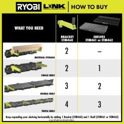 il sistema di stoccaggio modulare ryobi link sta rivoluzionando il settore dello stoccaggio, consentendoti di organizzare, accedere e trasportare la tua vita. il supporto per scaffale 2 in 1 ryobi link è progettato per riporre materiale da costruzione lungo o essere trasformato in uno scaffale. utilizzare le linguette di ritenzione del materiale per tenere saldamente pvc, legname, tasselli, aste, ecc. o accoppiare le staffe con un ripiano solido da 21″ o un ripiano in filo metallico da 21″. utilizza due staffe 2 in 1 per sostenere un ripiano o aggiungi una terza staffa per tenere due ripiani uno accanto all’altro, condividendo la staffa centrale. continua ad espandere il tuo sistema di scaffalature aggiungendo una staffa e un ripiano aggiuntivi in fila. meglio di tutto, fa parte della linea di prodotti del sistema di archiviazione modulare ryobi link che utilizza la stessa tecnologia di chiusura per connettere perfettamente il tuo mesigenze di archiviazione mobili e fisse. possiedi il tuo spazio con il sistema di archiviazione modulare ryobi link.