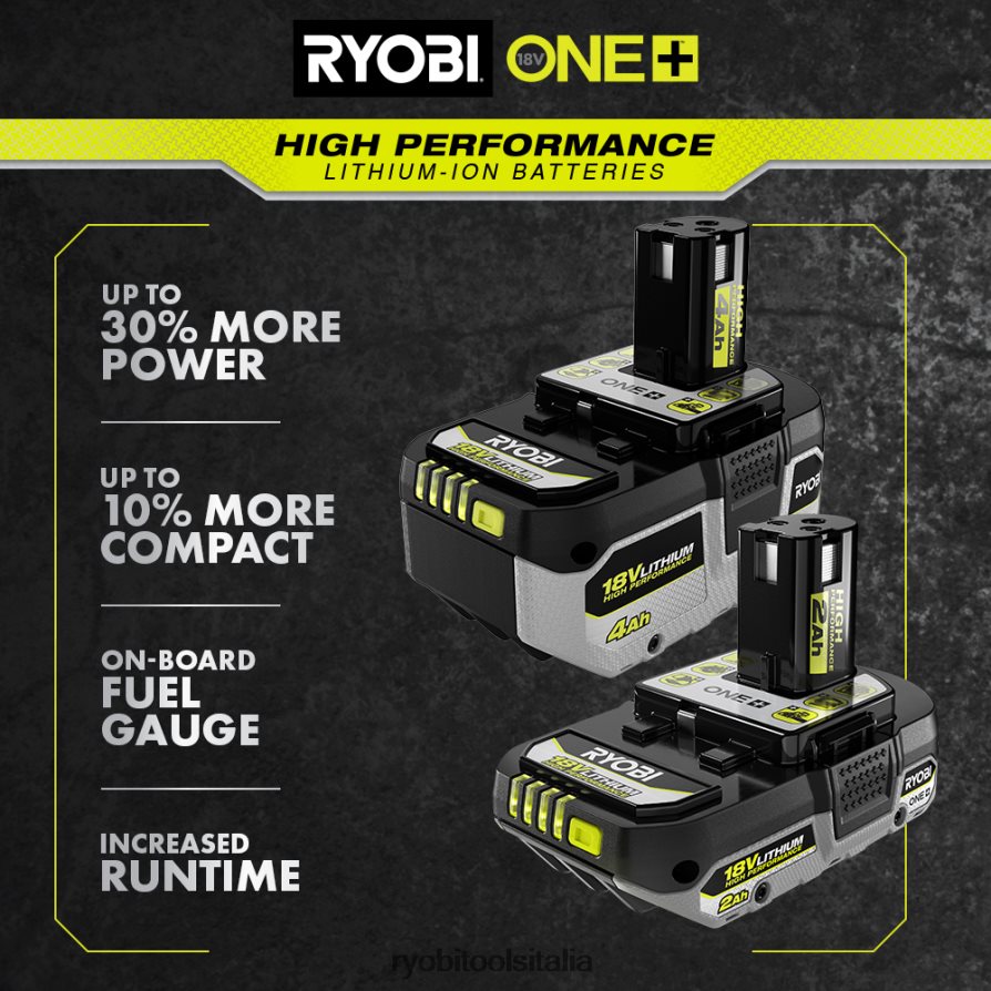 espandi il tuo sistema Ryobi 18v one+ con lo starter kit ryobi 18v one+ 4ah al litio ad alte prestazioni. questa batteria da 4 Ah offre un’autonomia fino a 4 volte maggiore rispetto al modello precedente, aumentando l’efficienza complessiva. La tecnologia delle batterie intellicell è dotata di un’elettronica avanzata che consente alle batterie di durare più a lungo, pensare in modo più intelligente e fornire fino al 30% di potenza in più. il design cool-core riduce la temperatura per ottimizzare le prestazioni della batteria e prolungarne la durata. le celle al litio avanzate massimizzano le prestazioni e l’autonomia durante le applicazioni più impegnative. il design robusto e la tecnologia antivibrazione aumentano la durata e migliorano l’esperienza dell’utente. questa batteria è dotata di un indicatore di livello carburante a LED ad alta visibilità per indicare chiaramente l’autonomia rimanente. installa e rimuovi facilmente la batteria con i fermi sicuri a sgancio rapido. abbina questa batteria al litio ad alte prestazioni con qualsiasi 18 V one+strumento hp per sfruttare i motori brushless ad alte prestazioni e l’elettronica avanzata per maggiore potenza, maggiore autonomia e la migliore esperienza complessiva sul sistema 18v one+. con una ricarica 2 volte più veloce rispetto al modello precedente, questo caricabatterie riduce significativamente i tempi di inattività. dotato di indicatori luminosi a LED, gli utenti possono facilmente identificare lo stato di carica della batteria. la modalità di risparmio energetico consente di risparmiare energia quando non si caricano o non si mantengono le batterie. per massimizzare lo spazio di lavoro, la possibilità di montaggio a parete garantisce l’organizzazione in qualsiasi momento. Questo kit di avvio ad alte prestazioni al litio 18 V one+ 4 Ah è coperto dalla garanzia del produttore di 3 anni Ryobi e include (1) batteria al litio ad alte prestazioni pbp004 18 V one+ 4 Ah, (1) caricatore rapido pcg004 18 V one+ e manuali dell’operatore.