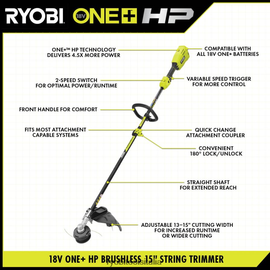 il decespugliatore Ryobi 18v one+ hp 15 pollici con attacco è la migliore combinazione di potenza e versatilità. ha un motore brushless per la massima potenza e durata. la capacità di attacco espandibile ti consente di trasformare il tuo rifinitore in una molatrice, un soffiatore, una sega ad asta e molti altri strumenti con gli accessori disponibili, il che significa che puoi risparmiare tempo, spazio e denaro. questo trimmer è dotato di bobina easy+ testina di avanzamento con manovella avvolgitrice che può essere ricaricata in 60 secondi o meno. il grilletto a velocità variabile e l’interruttore a 2 velocità offrono un maggiore controllo per qualsiasi applicazione. la larghezza di taglio regolabile da 13 pollici a 15 pollici consente di ottimizzare il rifinitore per una maggiore autonomia o una larghezza di taglio più ampia. questo design leggero e ben bilanciato ha anche una maniglia anteriore per il massimo comfort. backed da una garanzia di 3 anni. batteria e caricabatterie non inclusi.